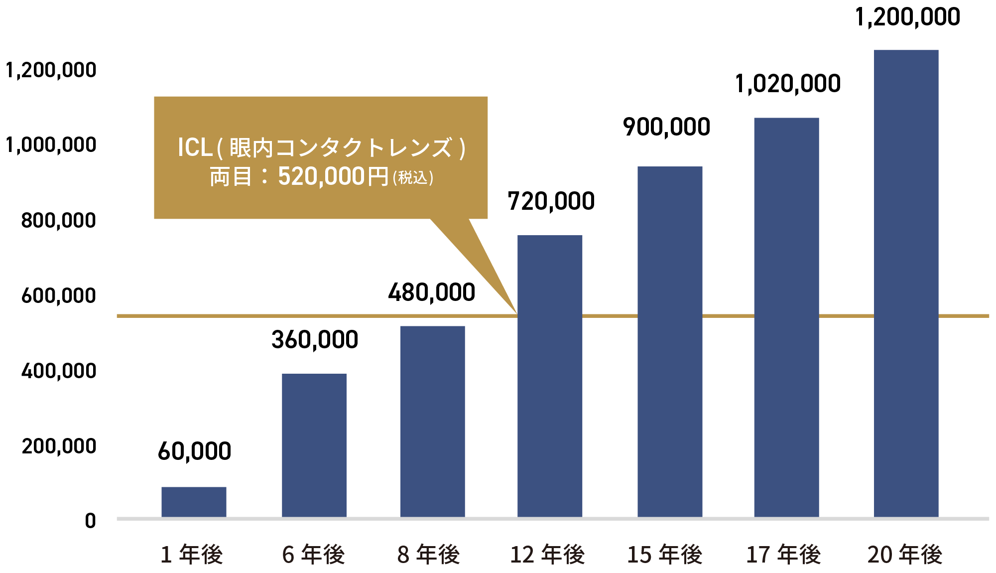 ICL は初期費⽤がかかるものの、12 年ほどでコンタクトレンズの累計費⽤が上回るため、⻑期的には経済的であり、快適な裸眼⽣活が得られるというメリットがあります。